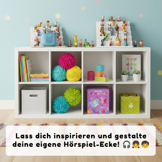 Ideal für junge Tonie-Fans, bietet dieses Regal eine funktionale und elegante Möglichkeit, die Sammlung sicher und ordentlich aufzubewahren.