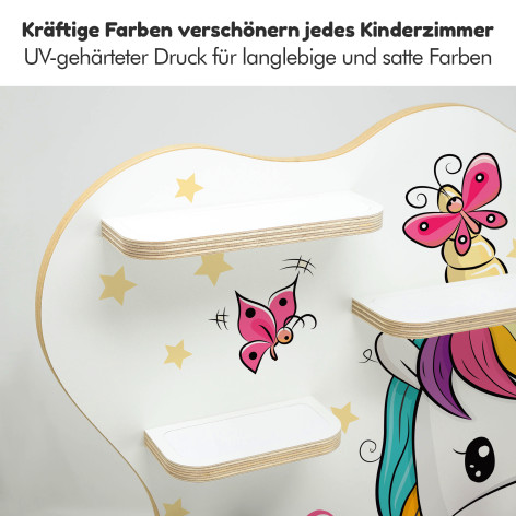 Die Kinder-Regale sind im Wortsinne eine runde Sache, denn Ecken und Kanten sind fein säuberlich abgeschliffen und gerundet. Sicher ist sicher. Wir arbeiten mit Multiplex-Platten und verzichten dabei bewusst auf kostengünstigere Alternativen wie Kunststoff oder Plastik. Unsere Motive sind mittels UV - Digitaldruck direkt auf der 10 mm Holzplatte aufgebracht.