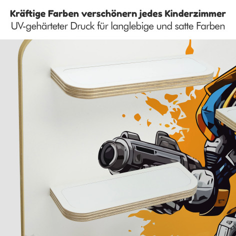 Die Kinder-Regale sind im Wortsinne eine runde Sache, denn Ecken und Kanten sind fein säuberlich abgeschliffen und gerundet. Sicher ist sicher. Wir arbeiten mit Multiplex-Platten und verzichten dabei bewusst auf kostengünstigere Alternativen wie Kunststoff oder Plastik. Unsere Motive sind mittels UV - Digitaldruck direkt auf der 10 mm Holzplatte aufgebracht.