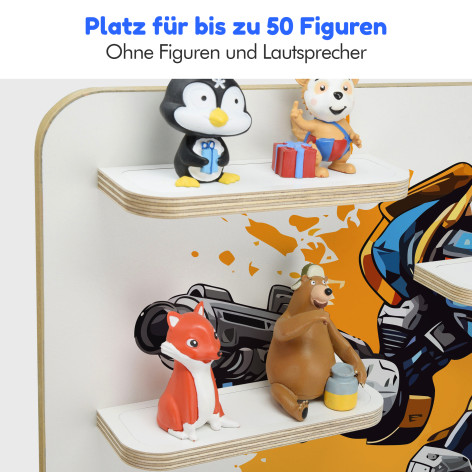 • Das Regal für die Aufbewahrung der Figuren bekommst Du als DIY-Set. Das heißt, dass Du alles für den Aufbau und die Montage mit im Lieferumfang erhältst und sofort selber loslegen kannst. Natürlich legen wir eine detaillierte Montageanleitung mit ins Paket, damit auch alles richtig angebracht wird (Dübel/Schrauben sind inklusive).