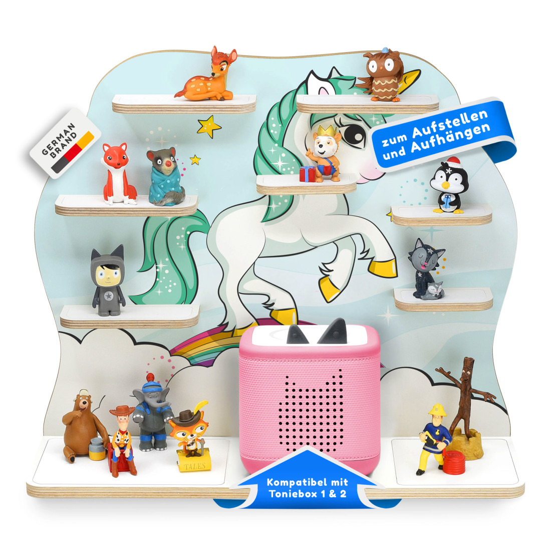 Am praktischsten sind die eingebauten Metallbleche, damit die Figuren magnetisch daran haften und nicht so häufig herunterfallen. Die Box steht bei uns auch nicht einfach lose auf der Halterung, sondern wir haben für den sicheren Stand der Musikbox einen abgekanteten Rahmen eingefasst. Wir legen Wert auf hohe Qualität. Die für den Druck verwendeten lichtechten Farbe sind nicht nur langlebig, sondern zeichnen sich auch durch ihre hohe Farbbrillanz aus. Zum Aufstellen oder Aufhängen - die Regale bieten individuelle Gestaltungsmöglichkeiten.