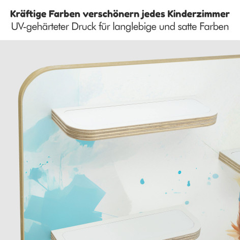 Die Kinder-Regale sind im Wortsinne eine runde Sache, denn Ecken und Kanten sind fein säuberlich abgeschliffen und gerundet. Sicher ist sicher. Wir arbeiten mit Multiplex-Platten und verzichten dabei bewusst auf kostengünstigere Alternativen wie Kunststoff oder Plastik. Unsere Motive sind mittels UV - Digitaldruck direkt auf der 10 mm Holzplatte aufgebracht.