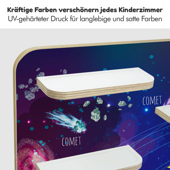 Die Kinder-Regale sind im Wortsinne eine runde Sache, denn Ecken und Kanten sind fein säuberlich abgeschliffen und gerundet. Sicher ist sicher. Wir arbeiten mit Multiplex-Platten und verzichten dabei bewusst auf kostengünstigere Alternativen wie Kunststoff oder Plastik. Unsere Motive sind mittels UV - Digitaldruck direkt auf der 10 mm Holzplatte aufgebracht.