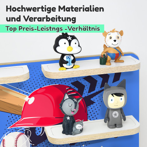 Die Kinder-Regale zeichnen sich durch ihre runde Form aus, da alle Ecken und Kanten sorgfältig abgeschliffen und abgerundet wurden – für zusätzliche Sicherheit. Wir verwenden hochwertige Multiplex-Platten und verzichten bewusst auf günstigere Materialien wie Kunststoff oder Plastik. Besonders praktisch sind die integrierten Metallbleche, die es ermöglichen, dass die Figuren magnetisch haften und seltener herunterfallen. Qualität steht bei uns an erster Stelle. Die Regale sind zum Aufhängen geeignet.